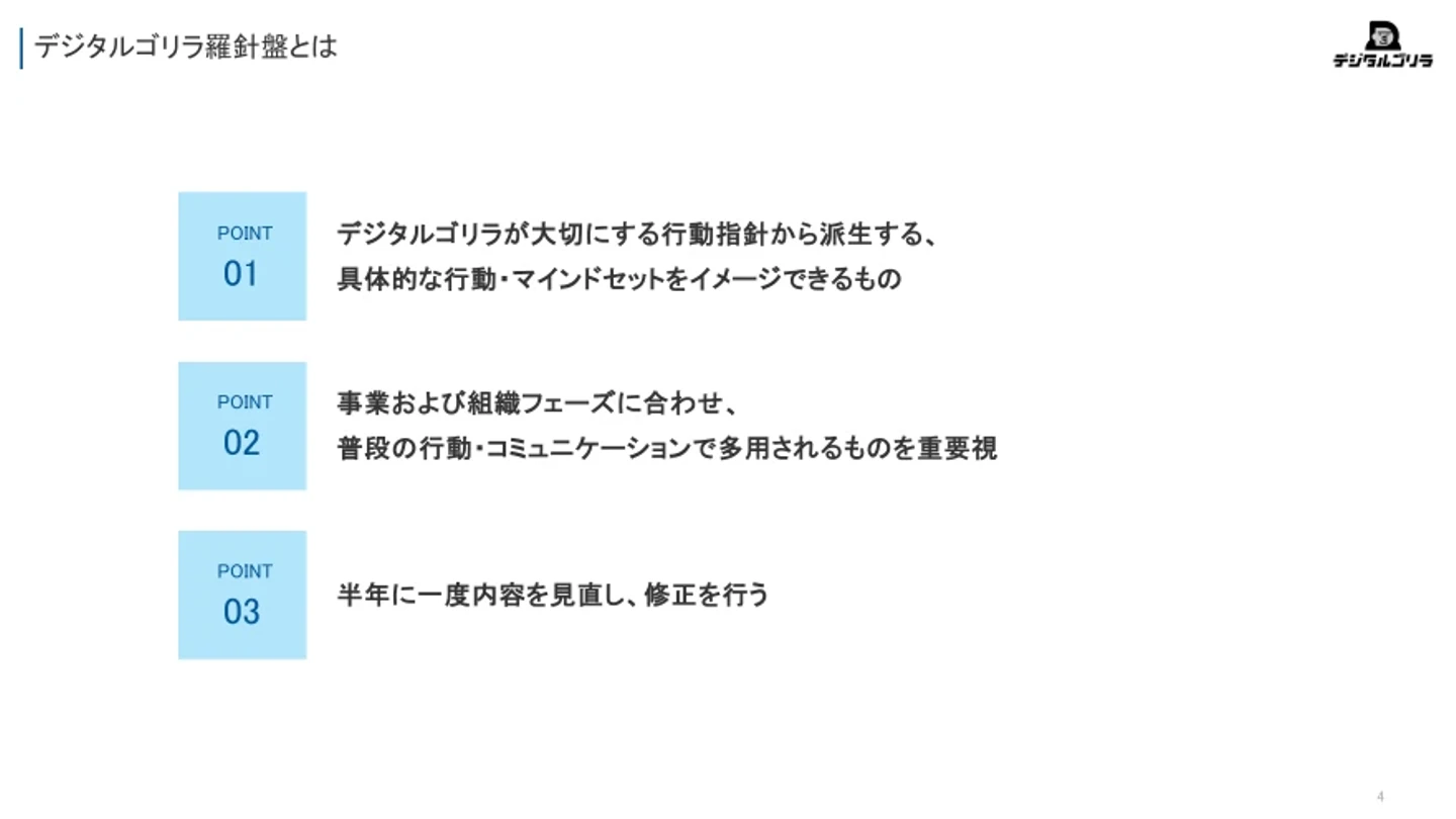 このような経緯から、昨年末の経営会議にて、会社として大事にしたい方向性・価値観を伝えるカルチャー資料【デジタルゴリラ羅針盤】を作りました。
