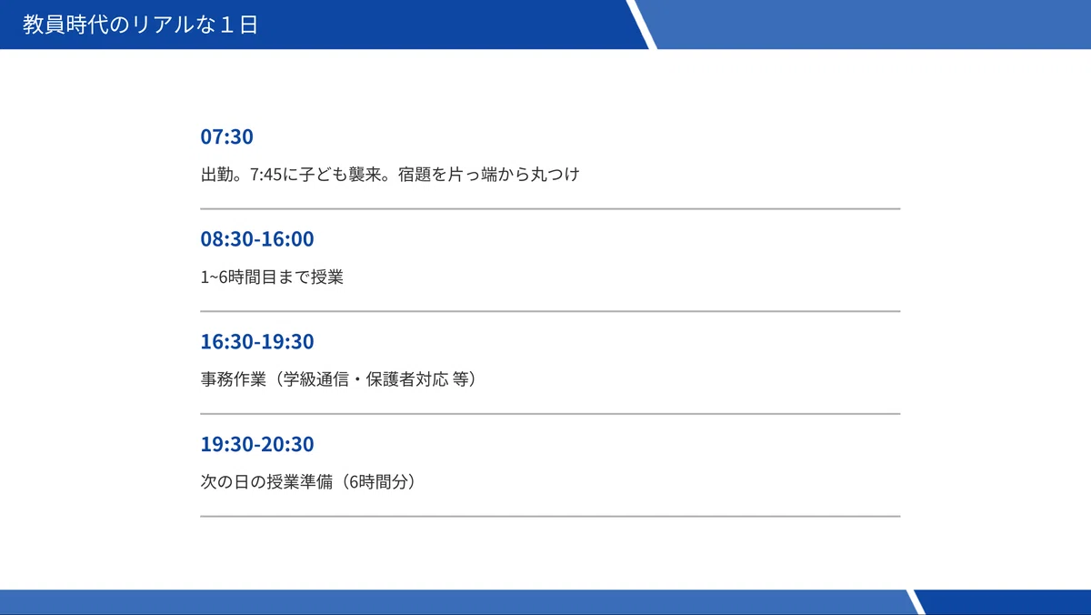 本来力を注ぎたい授業準備や個別サポートに十分な時間を確保できず、子どもたちの前で笑顔になれない自分もいました。