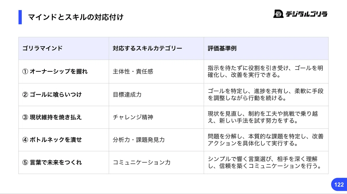 私たちは「デジタルゴリラ羅針盤」という行動指針を持っており、5つのゴリラマインドがメンバーの行動を支えています。