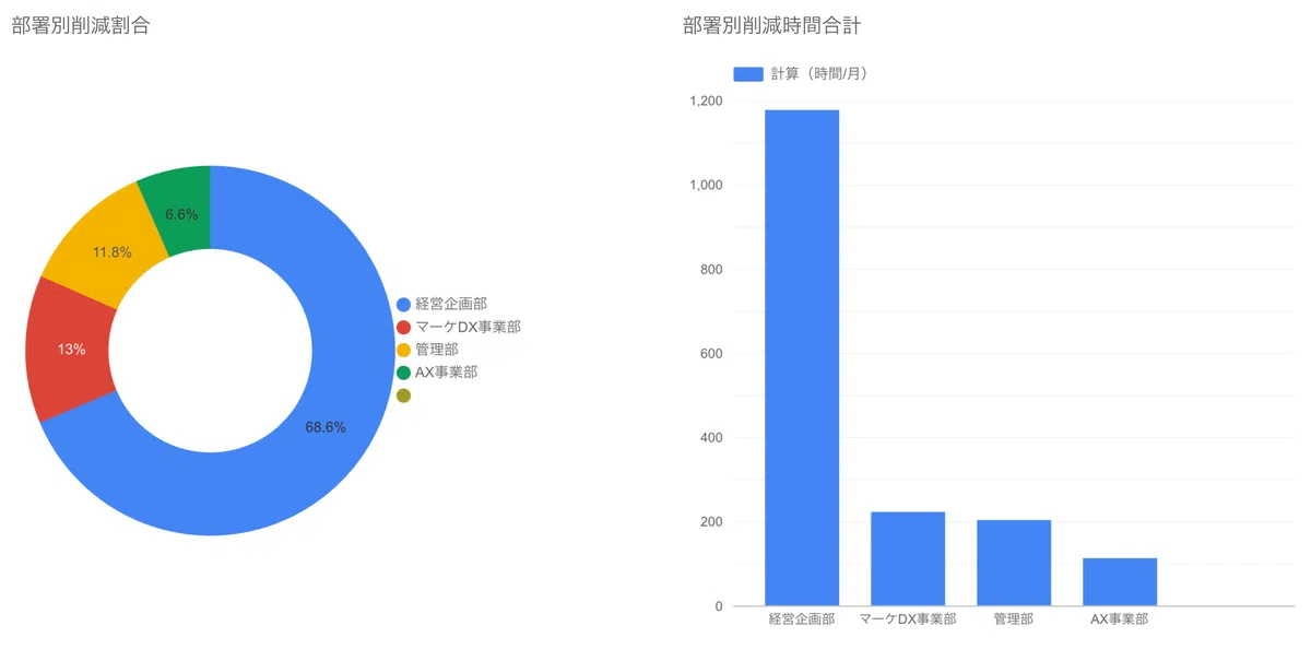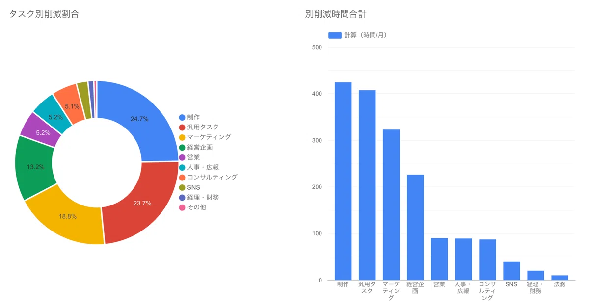 制作業務から経営企画まで、ほぼ全業務がAI化の対象。最大738時間から最小49時間まで個人差があることも、それぞれのメンバーがAIとの向き合い方を模索している証です。